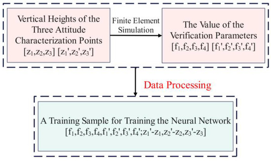 The sample set generated by LHS sampling consists of n samples, representing n different attitudes of the main engine. The values of the verification parameters at different attitudes are obtained through finite element simulations. As shown in Figure 10, by calculating the vertical height difference between attitude characterization points in any two samples, the vertical adjustment of the attitude characterization points can be determined, the values of the verification parameters before and after the adjustment are then combined, forming a training sample for training the neural network.