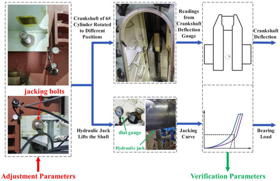The target measured samples will gradually expand with the iterative process of the propulsion system alignment. This includes (1) the adjustment amounts of the attitude characterization points predicted by the neural network, when the actual values of each verification parameter and the designed values are input into the neural network. (2) After mapping to the adjustment amount of the jacking bolts and performing the adjustment, the bearing load measured using the jack-up method, as well as the crankshaft deflection measured by placing a crankshaft deflection gauge at the measurement point between the crank arms, are recorded; the distance from the measurement point to the centerline of the crankshaft journal is , where is the stroke length of the diesel engine piston and is the diameter of the main journal [32]. The alignment process from the shipyard survey is shown in Figure 11.