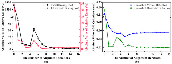 To improve the accuracy of the propulsion system alignment results, the expected relative error of the bearing loads compared to the design values should be within 5% and the expected absolute values of the crankshaft deflection should be within 0.05 mm. In the iterative alignment of the actual object, when all verification parameters meet the desired accuracy, the alignment is stopped. The trends of the relative error of the bearing loads and the absolute value of the crankshaft deflection are shown in Figure 13.