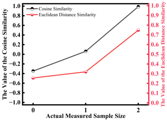 The EDS analyzes the absolute difference in the numerical distribution between matrices, with a value range from 0 to 1. The CS analyzes the relative positional similarity between matrices, with a value range from −1 to 1. When both similarities are equal to 1, it indicates that the two matrices are identical, meaning the model’s predicted results are exactly the same as the actual results. Figure 14 compares the changes in similarity between the adjustment parameter matrix predicted by the models obtained using different actual measured sample sizes combined with the proposed method and the actual adjustment parameter matrix.