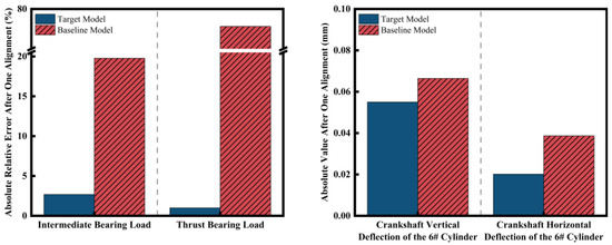 Error variation of each verification parameter. (a) Relative error of intermediate bearing load and thrust bearing load. (b) Absolute value of crankshaft deflection.