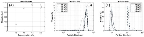 Flocculated illite clay at different clay concentration. (A) Median floc size obtained with Malvern ParticleSizer. (B) Volume-based particle size distribution obtained from the ParticleSizer. (C) Number-based particle size distribution recalculated from the data displayed in (B).