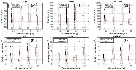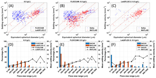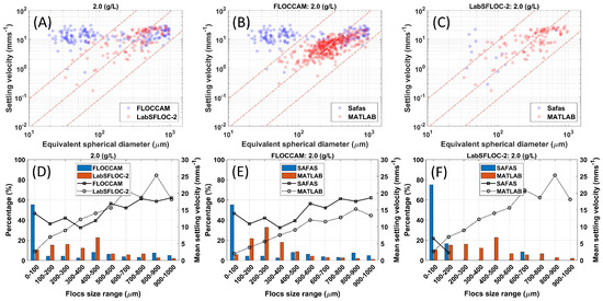 Comparison of floc sizes and settling velocities for different concentrations. Panels (A,D): videos obtained from LabsFLOC-2 and FLOCCAM and analysed with their respective softwares (Matlab, Safas). Panels (B,E): video obtained from FLOCCAM analysed using the two softwares. Panels (C,F): video obtained from LabsFLOC-2 analysed using the two softwares.