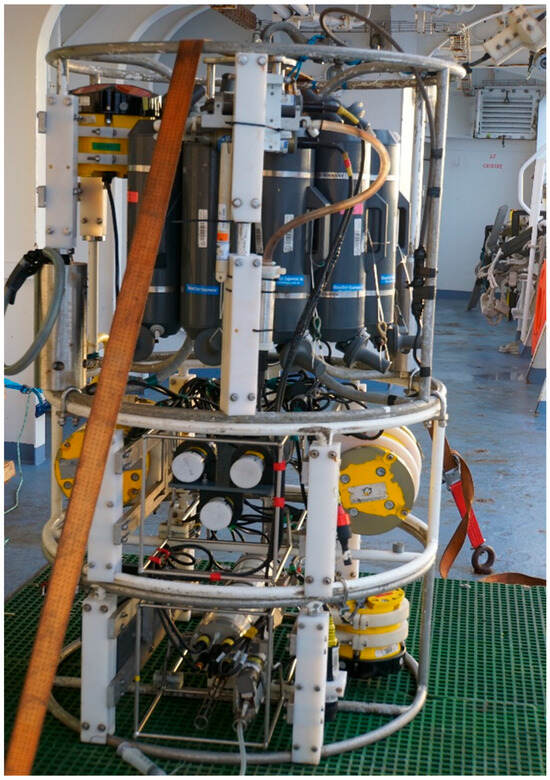Figure 1). This equipment is lowered at different depths, depending on the depth of the seafloor, via a trawl. This configuration makes it possible to exploit the conductivity–temperature (C–T) profiles obtained during downcasts. In order to exploit the upcast profiles by avoiding the water mixing in the carousel water sampler, the idea came to fix another C–T pair at the top of the carousel. This innovative configuration also opens up the possibility to assess the natural variability of the medium in terms of temperature between the downcast and the upcast in relation to a variable time scale of measurements (10 min to several hours). With properly calibrated sensors, in a quiet and homogeneous medium, this difference might be close to the calibration uncertainty or, in the best cases, to the resolution of the instrument. However, the profiles acquired during different campaigns at sea showed that this case is rarely met; several factors in relation to the natural variability and the instrument ensure that deviations are observed.