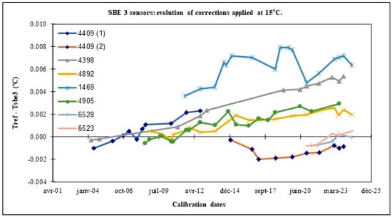 26]. It is generally very low: between 6 μK/year (sn 4409(2)) and 0.29 mK/year at 15 °C for the older SBE 3s (sn 4398 and sn 4409(1)). However, depending on use, the drift between two calibrations may be greater; for example, sn 6528 (pale blue) had been used in hard conditions, on a towed fish SeaSoar. For more information about the using of this towed fish, see reference [