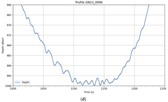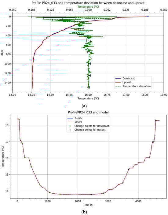https://github.com/deepcharles/ruptures (v1.1.9, accessed on 8 January 2025). The cost function measures the number of breakpoints in the signal. The constraint corresponds to the number of breakpoints to detect. After trials and evaluations of different solutions, we used the cost function “Continuous Linear (CLinear)”, which calculates the fitting error between the signal and a straight line. The research function we used is “Dynamic programming (Dynp)”, which finds the minimum sum of costs by calculating the cost of all the sub-sequences of the signal under study. There can be a maximum of 29 breakpoints per descent and 29 per ascent, corresponding to 60 gradients per profile. To avoid false detections due to the oscillating movements of the boat, the time between two detections is filtrated to 24 × 1/