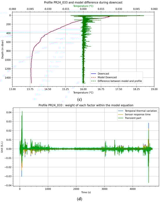 Figure 3c shows the same results for the downcast temperature profile as a function of pressure, with added signal of error between the model and the measured temperature. This error signal is significant in the first 10 m, but its maximal amplitude is between −0.012 °C and 0.05 °C so that the deviation signal of the figure (a) is between −0.2 °C and +0.10 °C. If this profile was used as a reference in data assimilation, its uncertainty or representativity would be 0.3 °C at this depth, so the model error is 0.065 °C at the same depth. The origin of these errors can be partially attributed to the assumption that the term