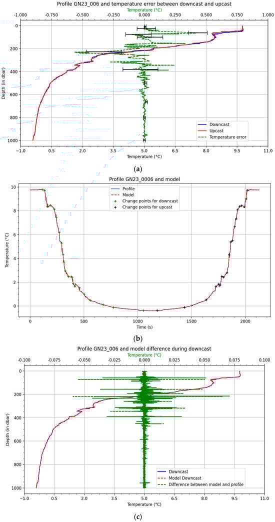 Figure 4c shows the downcast temperature profile as a function of pressure, with the numerical model superimposed, and in green the point by point errors between the model and the measured signal. It appears that the instantaneous errors are about ten times smaller than the spikes of the deviation signal of the