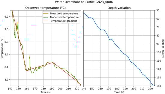 Figure 4b, between 140 and 230 s. We can see that rapid temperature variations of up to 0.26 °C are taken into account by the numerical model, but they are not considered in the gradient’s detection. It is likely that, with these oscillations, the carousel is dragged downwards then upwards (between 140 and 150 s) then upwards only (between 160 and 170 s), generating a mixing of the medium and large temperature measurement errors, compared with the gradients that should be measured. The sea state must therefore be accounted for when processing temperature profiles, as it can cause significant measurement errors, and in this case it is difficult to distinguish the part of the measurement uncertainty linked to the natural variability of the environment and the part linked to the mixing of the medium by the carousel.