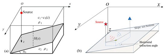 The horizontal refraction scene. (a) Schematic of the ocean waveguide with a wedge bottom. denotes the slope inclination angle. The speed in the water column is a function of depth. (b) The horizontal refraction angle.