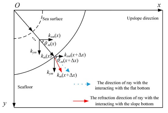 Figure 2 presents the concept of the horizontal refraction phenomenon. The path of the ray propagation remains the same after the reflection from the sea surface, considering that the sea surface is a horizontal interface with a constant sound speed and density in the horizontal direction. In contrast, the situation changes when the ray interacts with the seabed, revealing a reduction in the value of , as the sea depth decreases along the -axis. In addition, the value of remains constant due to the range-independent environment along the -axis. Therefore, the value of increases with the decrease in .
