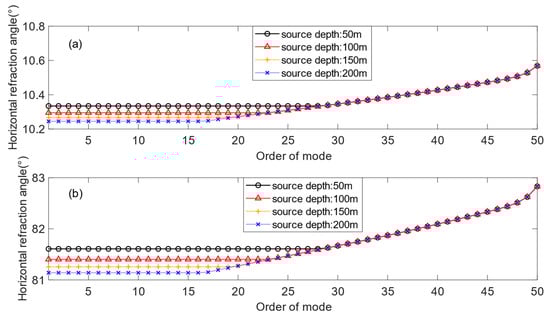 Figure 4 shows an interesting phenomenon. It is well known that the horizontal refraction angle increases with the order of the mode, but the refraction angles are equal in the case of low-order modes at the same source depth. When the grazing angle approaches zero, as depicted in Figure 3b, the horizontal refraction angle remains the same and does not vary with the corresponding modal order. Furthermore, the horizontal refraction angle decreases with the increase in source depth. It can be found that the horizontal refraction is related to the modal order and the source depth, and the modal coupling is caused by the horizontal environment variation.