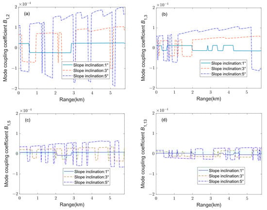 Inter-mode coupling coefficient at ranges of 0–5.8 km of different slope inclination angles. The frequency is 100 Hz. The distance grid for calculating coupling coefficients is 0.2 m. (a) Mode 1 with 2, (b) mode 1 with 3, (c) mode 1 with 5, and (d) mode 1 with 13.