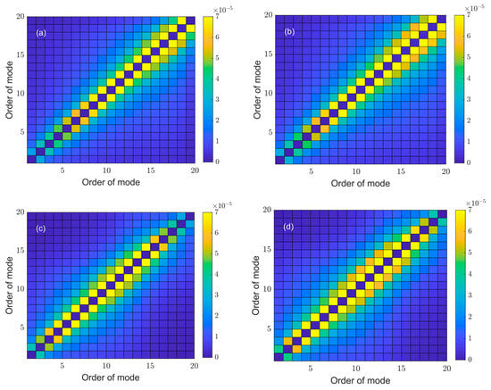 Figure 10 depicts the amplitude of , indicating the effect of mode coupling except for the th order. The value of is notably lower than that of . For the th mode, the impact of the other orders of modes is modulated by the coupling coefficient matrix, and the influence of those modes on horizontal refraction is considerably smaller than that of the th mode. This finding indicates that the adiabatic assumption can be used when the effect of the modal amplitude on horizontal refraction is small. When the source depth is shallower, fewer dominant modes are excited, resulting in a lower overall influence of the other mode than that at a deeper source depth. With the same frequency and slope inclination angle, the disturbance of demonstrates that the order of the mode is mainly excited by the source. As shown in Figure 10a, the disturbance of stripes is noticeable around the 28th order, corresponding to Figure 9a, and the orders of the mode decrease with the increase in range.