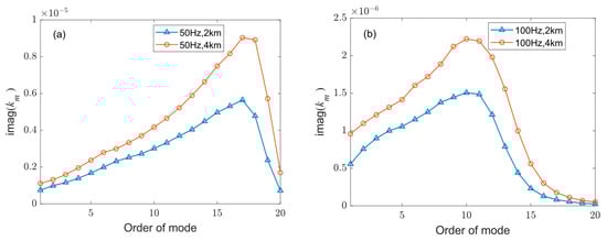 Figure 6 shows the mode coupling coefficients as the function of source frequency. The figure reveals that the lower-order modal energy of the low-frequency signal is more stable at the same range, while its higher-order modal energy is more likely to be exchanged with neighboring modal energy. Figure 7 presents the imaginary parts of eigenvalues with 50 and 100 Hz frequencies, thereby explaining this phenomenon. As shown in Figure 7a, at a frequency of 50 Hz, the imaginary part of the eigenvalue of higher-order modes notably increases with the decreasing depth of seawater, thereby more energy is transferred to nearby orders of modes. In contrast, at a frequency of 100 Hz, the imaginary part of the eigenvalue around the 10th-order mode substantially increases, and the corresponding mode coupling coefficient value is large (Figure 7b). Figure 8 shows the variation in the inter-mode coupling coefficient with range at different frequencies. This figure indicates that the oscillation amplitude of the inter-mode coupling coefficient at a higher frequency is greater than that at lower frequency. Furthermore, the inter-mode coupling coefficient of low-frequency signals is relatively stable.