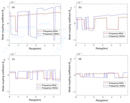Inter-mode coupling coefficient at ranges of 0–5.8 km for different frequencies with a slope inclination of 3°. (a) Mode 1 with 2; (b) mode 1 with 3; (c) mode 1 with 5; (d) mode 1 with 13.