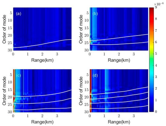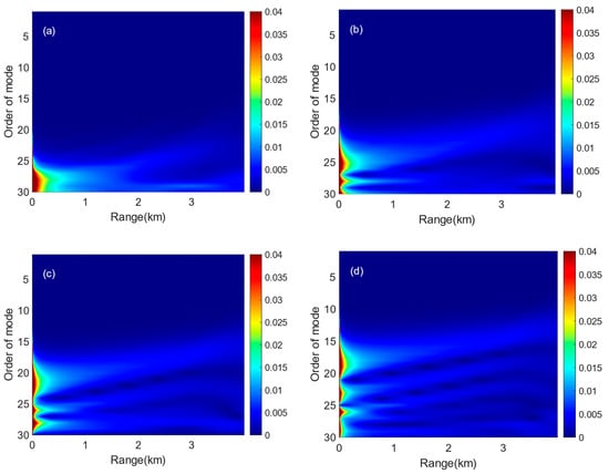 Figure 9 shows the relationship between the source depth and the excited modal amplitude. When the source is close to the surface, the higher orders of primary modes are excited. Conversely, as the source depth increases, the dominant excited modes gradually decrease in order, but the intensity of the excited modes increases, as shown in Figure 9a–d. Figure 9a shows that when the sound source is near the surface, the energy of the excited higher-order modes rapidly attenuates with distance. Additionally, the number of excited orders of the mode increases with the sound source depth. This phenomenon promotes energy propagation over long distances. Furthermore, the decrease in the depth changes the eigenfunction structure, resulting in a highly complex distribution of mode amplitudes along the modal dimension as distance increases. Consequently, the energy tends to shift toward low-order modes, as shown in Figure 9d.