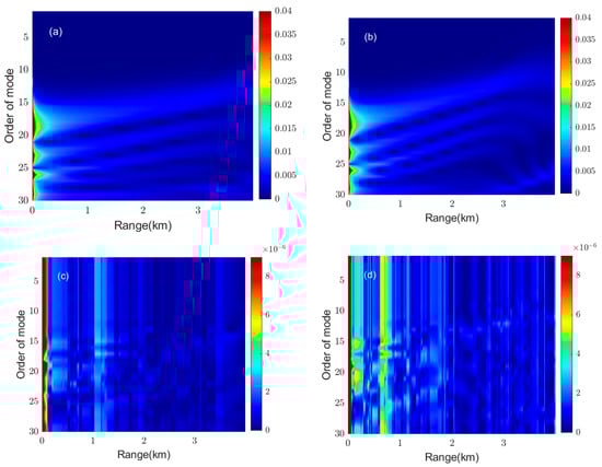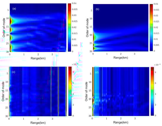 Values of mode coupling within ranges of 0–4 km of different frequencies with a source depth of 150 m and a slope inclination angle of 3°. (a) The amplitude of at a frequency of 50 Hz. (b) The amplitude of at a frequency of 100 Hz. (c) The amplitude of at a frequency of 50 Hz. (d) The amplitude of at a frequency of 100 Hz.