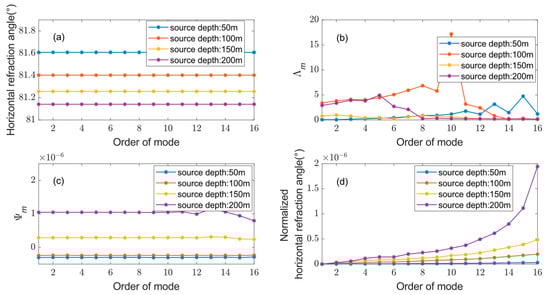 At different source depths, the ray corresponding to the same order of the mode has a different propagation distance after the first interaction with the seafloor. Figure 13c depicts the value of parameter , showing the effect of mode coupling except for the th order on horizontal refraction. A deeper source depth results in a greater influence of mode coupling of the other orders. Considering this phenomenon, according to Equations (13) and (21), a shallower source depth leads to a larger horizontal refraction angle. The effect of the modal order on horizontal refraction was also analyzed with the same source depth by normalizing the horizontal refraction angle of the first-order mode. The horizontal refraction angle increases with the order. However, the increment of the angle is extremely minute and can be ignored in practice.
