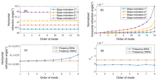 According to Equation (22), the horizontal refraction angle is influenced by the source depth, the source frequency, and the slope inclination angle. Further analyses of mode coupling effects are presented below.