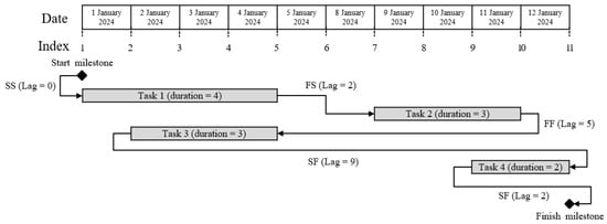 The key components of a project scheduling problem are tasks and relations. Tasks include essential details such as task type, minimum and maximum durations, and associated calendars and disciplines. A distinct category of tasks, known as milestones, represents critical events or key points in project progress that occur at specific moments in time. Milestones, unlike regular tasks, do not have durations and can be categorized as either start milestones or finish milestones. Figure 1 illustrates an example of a schedule that comprises tasks, milestones, and different types of relations.
