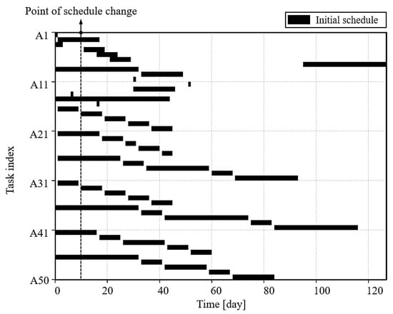 To evaluate the applicability of the proposed model in real-world scenarios, it was applied to an industrial case in a shipyard involving 857 tasks and 1400 relations. These tasks encompass typical design scheduling activities such as structural analysis, equipment layout design, and review and approval cycles (e.g., 30%, 60%, and 90% reviews, HAZOP/HAZID). Each task is interconnected through dependencies that define the sequence and timing of operations, reflecting the complex and multidisciplinary nature of shipbuilding projects. The dataset used in this case represents an anonymized but realistic design scheduling scenario. The tasks were indexed (e.g., A1 to A857) to ensure confidentiality while maintaining the integrity of the dependencies and durations. This ensures that the test conditions accurately reflect the challenges encountered in actual shipbuilding projects, such as handling interdependencies among disciplines and responding to changes in task requirements. Figure 5 illustrates the initial schedule, with requirement changes introduced at time period 100. These changes included modifications to the durations of 20 tasks and the lag time of 20 relations.