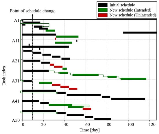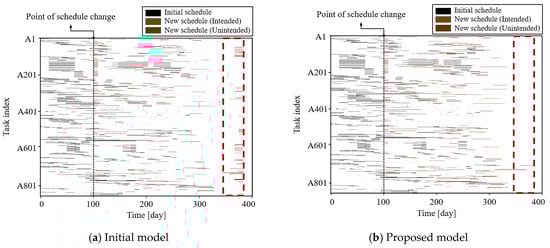Although the same requirement changes were applied, the results differ significantly. The proposed model demonstrates a marked reduction in unintended adjustments, as evidenced by the fewer colored bars in the Gantt chart. As mentioned earlier, green bars indicate intended changes made to meet the specified requirements, while red bars highlight changes that were not planned or desired but occurred as a result of the rescheduling process. These adjustments, representing deviations from the initial schedule, highlight the model’s ability to minimize disruptions. The representative difference between the initial model and the proposed model can be found by comparing the red bounding boxes in Figure 6a,b. In Figure 6a, it is noticeable that many tasks are concentrated near the project’s end time compared to Figure 6b. This phenomenon often occurs in scheduling models that focus solely on minimizing the project makespan while adhering to task characteristics and relationships. A quantitative comparison of the differences from the initial schedule is provided in Table 12.