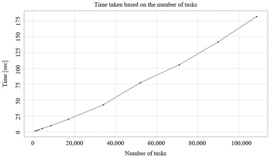 The execution time for each scenario is presented in Figure 7. The results show that scheduling for fewer than 2000 tasks was completed within 2 s, while scheduling tasks exceeding 100,000 took approximately 3 min. These findings demonstrate that the proposed model is capable of effectively handling schedule adjustments for extremely large-scale projects, significantly larger than typical design scheduling problems encountered in shipbuilding and offshore unit design projects. This scalability highlights the robustness and practical applicability of the model for complex, large-scale design scheduling scenarios.