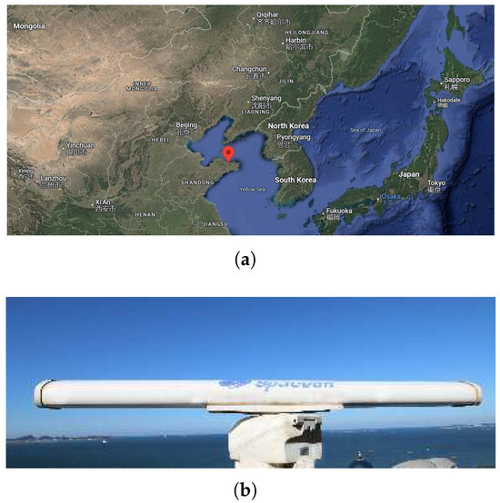 The X-band radar measured sea clutter dataset is derived from the “Sea-detecting X-band Radar and Data Acquisition Program”. The X-band radar is located on Yangma Island in Yantai, a northern city in China, approximately 50 m inland from the coastline and at an elevation of about 30 m above sea level. The radar has a field of view of approximately 180°, and data were collected under sea state conditions ranging from levels 1 to 4. The specific coordinates of the radar are 121°36.7′ E and 37°28.35′ N, as illustrated in Figure 2.