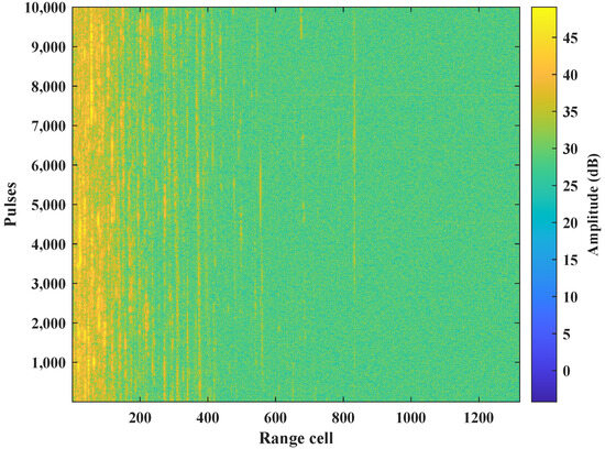 The radar operates in the X-band with a frequency range of 9.3–9.5 GHz, using HH polarization, a pulse width of 40 ns, a pulse repetition frequency (PRF) of 3000 Hz, and a range resolution of 6 m. The grazing angle range for significant sea clutter data is approximately 0.3° to 15°. The X-band radar data selected for this paper are from the first quarter of 2019. The range–pulse diagram of this data is shown in Figure 3.