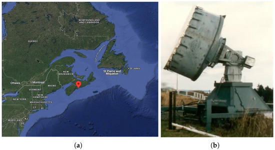 The IPIX radar dataset is a large database obtained by McMaster University in Canada in 1993 and 1998 using the IPIX radar, which was installed on a cliff 30 m above sea level. The radar was directed toward the Atlantic Ocean, and the target to be detected was a floating sphere with a diameter of 1 m wrapped in aluminum wire. The radar beam width was 0.9°, and the range resolution was 30 m. The radar operated in a dwell mode, with each data file containing 14 range cells, each with 131,072 sampling points, and a dwell time of approximately 131 s. The IPIX radar can transmit both horizontally and vertically polarized electromagnetic waves and can utilize two linear receivers to achieve horizontal and vertical reception. Therefore, during data acquisition, the radar typically obtained HH, VV, HV, and VH types of polarized radar echo data. This paper employs data from 1993, covering sea states ranging from level 2 to level 4. The radar was installed at coordinates 44°36.72′ N and 63°25.41′ W, as illustrated in Figure 4.