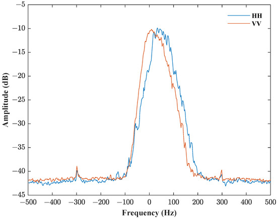 The Doppler spectrum estimation results of the sea clutter measured by the IPIX radar under HH and VV polarization modes are shown in Figure 6. As illustrated in Figure 6, the central frequency of the Doppler spectrum is positive, indicating that the sea waves are moving towards the radar. The Doppler spectrum width, central frequency, and other parameters were sensitive to the polarization mode, suggesting that the dominant scatterer types differ between polarization modes [43].