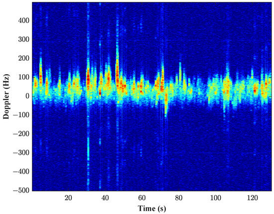 When analyzing the time-varying characteristics of sea clutter spectrum, it is important to select an appropriate time segment. If the duration of the data segment is less than the gravity wave period, the local power level of the sea clutter remains approximately constant, and the sea clutter can be regarded as a quasi-stationary random signal. Therefore, when segmenting the data, the correlation time of the sea clutter data must be considered, along with the length of each data segment to enhance the spectral estimation resolution. The IPIX radar #40 dataset, totaling 131 s, was used with HH polarization to plot the Doppler variation over time, as shown in Figure 7. Figure 7 demonstrates that the Doppler frequency of the sea clutter continuously changed over time.