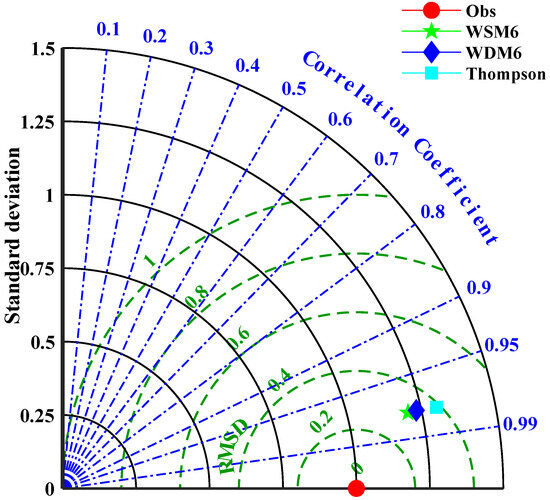 The model employs a three-layer nested grid configuration, with the finely nested third layer primarily covering the radar detection area. The grid resolution-to-time ratio in the WRF model was set to 3, ensuring optimal spatial and temporal resolution. Initial and boundary conditions were initialized using ERA5 data [44], ensuring reliable inputs for meteorological simulations. ERA5 is the fifth generation ECMWF reanalysis for the global climate, with a temporal resolution of 1h and a spatial resolution of 0.25° for the WRF model. In most cases of WRF model simulations, the choices of grid size and integration step depend on the scale of the experiment, available computational resources, and other factors. In this paper, the grid size was primarily selected based on the radar resolution, while the integration time was set to five times the grid size, measured in kilometers, as recommended on the official WRF website. According to the WRF guidelines, when the grid size is less than 4 km, the impact of the cumulus parameterization scheme is relatively small. Therefore, in the sensitivity experiments conducted in this paper, the focus was mainly on the microphysics schemes, with the WSM6, WDM6, and Thompson schemes selected for comparison [45]. The Taylor diagram [46] of the parameterization results for the three different microphysics schemes is shown in Figure 8, with the WSM6 scheme, which exhibited the highest accuracy, ultimately selected. For the other parameterization schemes, the high-precision schemes available in the WRF version were chosen.