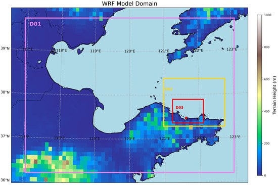Based on the publicly available X-band radar dataset [47], the computational area for this paper was set in the northern Yellow Sea, with a longitude range of 117° E to 123° E and a latitude range of 36.2° N to 39.8° N. The computational area is shown in Figure 9. The radar station is situated on Yangma Island in Yantai City. The red rectangle represents the third nested grid of the WRF model, where the location of the X-band radar on Yangma Island is indicated by a red upward triangle with coordinates of 121°36.7′ E and 37°28.35′ N.