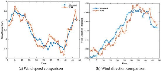 Taking the X-band radar dataset as an example, this study validated the accuracy of oceanic dynamic parameters simulated by the WRF model. After setting the research area and the driving files for the WRF model, the wind speed and wind direction at a certain point in the X-band radar detection area were simulated. The simulation time was from 0:00 on 12 October 2019 to 0:00 on 13 October 2019, and the results were output every 30 min for a total of 49 datasets. The parametrization scheme was adjusted according to publicly available sea state data parameters. The simulation results are shown in Figure 11. The Mean Squared Error (MSE) of the wind speed obtained from WRF simulations compared to the measured data came out to 0.0614, the Root Mean Squared Error (RMSE) came out to 0.2478, the Mean Absolute Error (MAE) came out to 0.2117, and the coefficient of determination () came out to 0.8679. For wind direction, the MSE came out to 10.0536, the RMSE came out to 3.1707, the MAE came out to 2.8445, and the came out to 0.8636. The results from the WRF simulations closely align with the measured data.