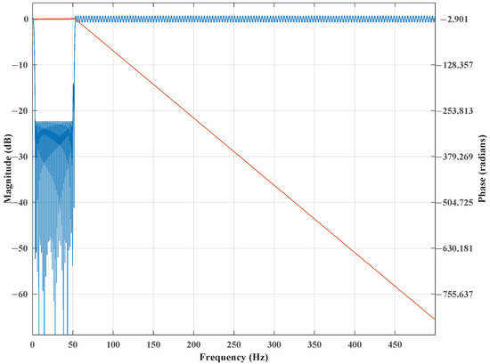 The amplitude and phase responses of the FIR filter designed based on the power spectrum of the measured data are shown in Figure 13. The blue line represents the amplitude response, and the orange line represents the phase response.