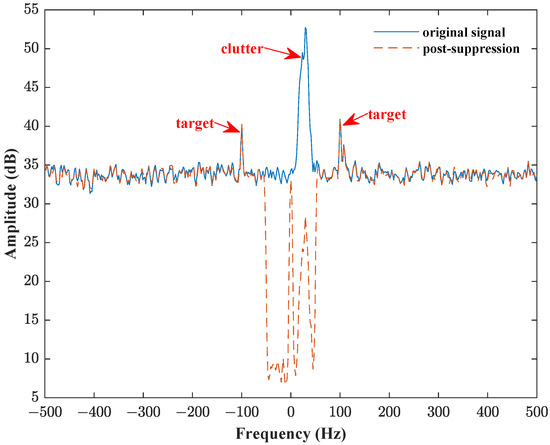 After adding the target signals at −100 Hz and 100 Hz to the measured radar dataset, the radar range–Doppler (RD) diagrams before and after ocean dynamics suppression are plotted, as shown in Figure 16. The radar RD diagram converts the radar echo signal into a two-dimensional representation of the range and Doppler frequency, where the horizontal axis represents Doppler frequency and the vertical axis represents range cells. As seen in Figure 16a, the clutter Doppler frequency varies little within 50 range cells. From the suppressed diagram in Figure 16b, it can be observed that the clutter near zero frequency was mostly filtered out, while the two target signals at −100 Hz and 100 Hz were successfully retained.