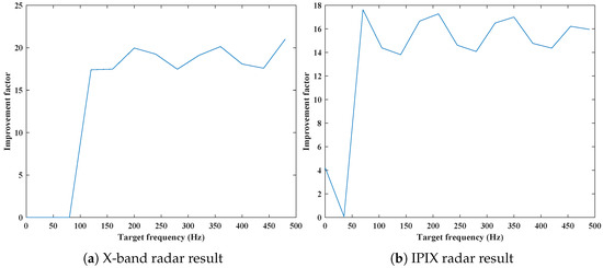 Simulated targets of different frequencies are added to the sea clutter, and the improvement factor of sea clutter suppression based on ocean dynamics is shown in Figure 17. As can be seen from Figure 17, filters at different target frequencies have certain improvement effects. In particular, when the target frequency lies outside the power spectrum of sea clutter, the average improvement factor of the filter can reach 17.22, demonstrating the effectiveness of the proposed method in suppressing sea clutter.
