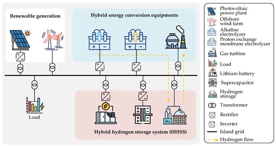 The focus of this study is to explore the potential of hybrid energy storage systems, including hydrogen storage systems, lithium batteries and supercapacitors, to compensate for intermittent generation in highly renewable-penetrated island microgrids. The configuration of the island microgrid is illustrated in Figure 1.