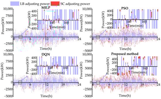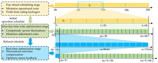 Figure 2 shows that the proposed optimal multi-time-scale operation framework divides power management into three distinct stages, each tailored to address power fluctuations at a specific time scale by leveraging the response characteristics of various energy storage and conversion devices. The day-ahead scheduling stage operates using 1 h scale optimization to minimize operational costs and to optimize hydrogen production for revenue generation. Based on this schedule, the first-stage intraday optimization operates using 15 min scale optimization to mitigate power fluctuations, and using lithium battery and proton exchange membrane electrolyzer devices. The real-time adjustment stage, as part of the rolling optimization process, operates at a 1 min resolution and utilizes supercapacitors and lithium batteries to address fluctuations within the 15 min window. Feedback from the real-time adjustment stage is incorporated into the intraday optimization stage, creating a dynamic two-stage rolling optimization process that enhances system responsiveness and stability.