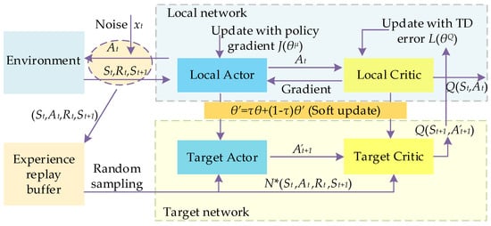 As shown in Figure 3, action is generated by the local actor network. Ornstein–Uhlenbeck (OU) [36] noise is added to enhance exploration. The action is executed in the environment, the system state is updated, and a corresponding reward is returned. The interaction data () are stored in the experience replay buffer. is the target action generated by the target actor network under state . During each training step, a batch of experiences is sampled from the buffer for training. The target critic network is used to approximate the state-action pair at + 1. The local critic network updates on the basis of to minimize the temporal difference (TD) error. The local critic network is optimized by the network loss function defined in Equation (34) [37].