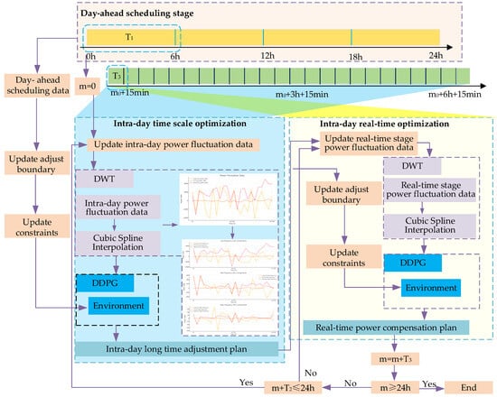 As shown in Figure 4, DWT and DDPG are used to handle power fluctuations and optimize the scheduling strategy, enabling intelligent power allocation in response to renewable variability. The framework operates as follows: