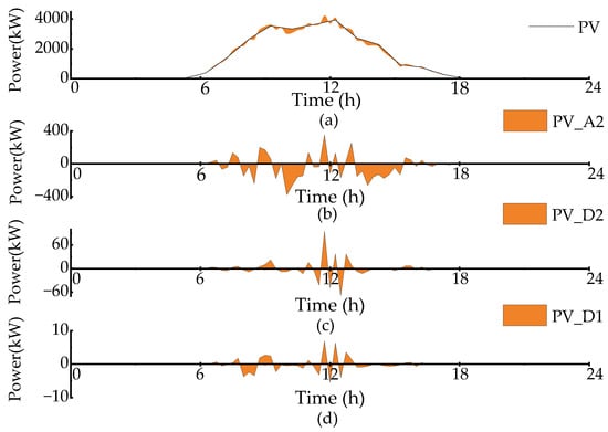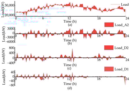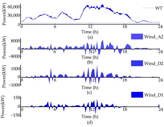 DWT is a time–frequency analysis tool that decomposes signals across various frequency proportions, providing both time and frequency information [31]. Owing to its excellent ability to capture nonstationary signal variations, DWT has been applied in many research fields, such as energy forecasting, state estimation, fault detection, and differential protection. In this work, the power fluctuations in the island microgrid are decomposed into low-frequency, medium-frequency, and high-frequency parts for different time-scale optimizations.