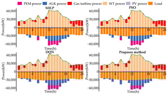 Action (): The action space is denoted as , which represents the control over the ALK, PEM, and hydrogen blending ratio for the gas turbine.