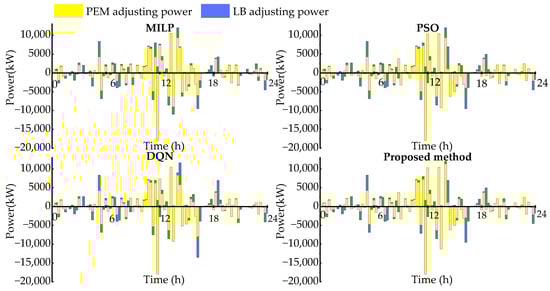 Following the day-ahead scheduling results, DWT is used in the first intraday stage to decompose 15 min power fluctuations into three frequency proportions. Low-frequency power fluctuations are compensated by the hydrogen production device for long-term management, medium-frequency power fluctuations are mitigated by both hydrogen production devices and the lithium battery, and high-frequency power fluctuations are smoothed out by the lithium battery. The decomposition process is described in Equation (32).