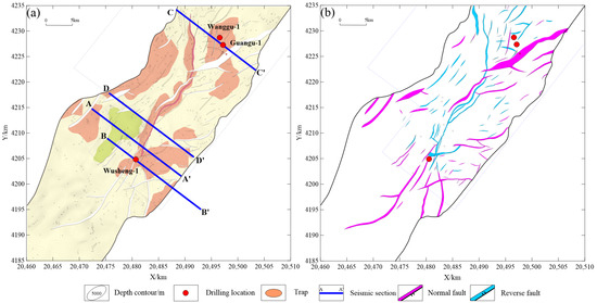(a) Structural diagram of the lower boundary of the Shihexia Formation in the Wangguantun–Wumaying area. (b) Diagram of the lower boundary fault system of the Shihexia Formation.