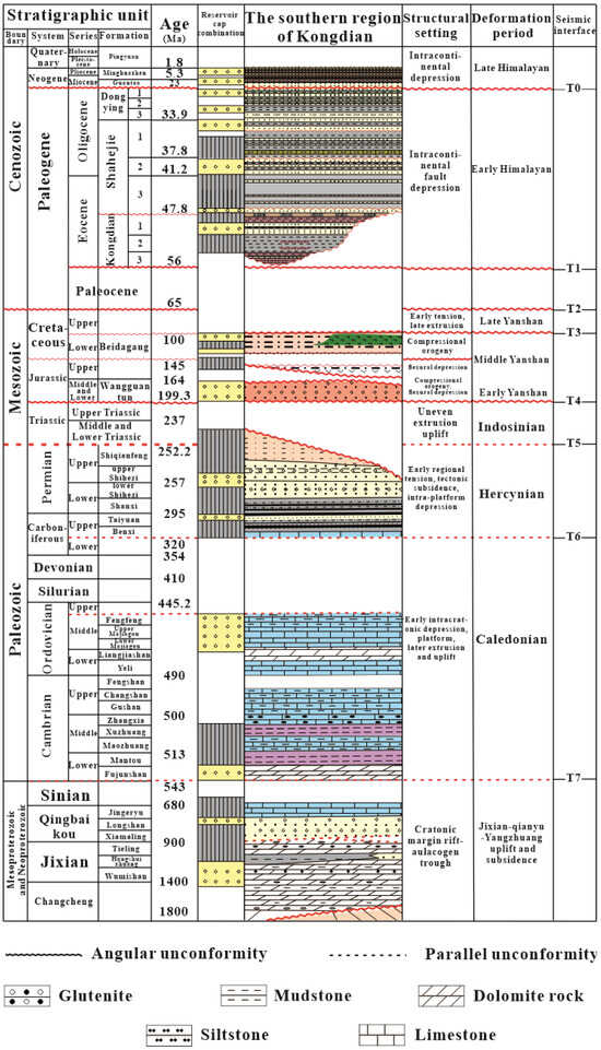 Predominantly comprised of the Lower Tertiary series, featuring graben and conjugate extensional normal fault systems as the primary structural elements, with widespread development of NE-trending strike-slip faults. The underlying Mesozoic–Paleozoic strata exhibit a complex array of fault structures, including anticlines and thrusts formed during the Indosinian to Yanshanian orogenic events. The development of the above overlying conjugate extensional normal fault systems indicates the control exerted by ancient structures on later faulting processes. Seismic profiles reveal a significant and extensive unconformity between the Kongdian Formation and the underlying Mesozoic strata, extending beyond the boundaries of the basin area. In different regions, the underlying formations consist of J3−K−, J1+2, or T strata. The unconformity interface (Ek3 base interface) is mainly characterized by medium to high-amplitude reflections, moderate to poor continuity, and medium to low-frequency 1–2 phase reflections. The area is predominantly characterized by fault depression and basin sedimentation, exerting a certain degree of modification on the earlier formed anticlines and synclines structures.