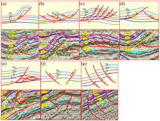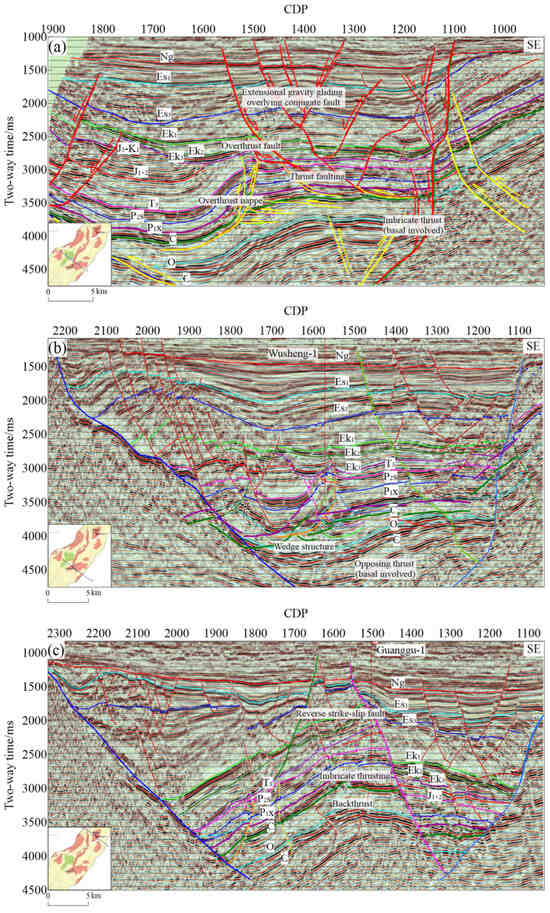Overall, it is characterized by backthrust structural features, consisting of thrust backfolds and basement-involved imbricate thrust faults. The thickness of the layer ranges from approximately 1300 to 1600 m, characterized by a burial depth that increases from north to south and thinning from west to east. This area is an intracratonic depression, dominated by restricted to open platform facies carbonate rock deposition [54]. As shown in Figure 3, the seismic profile illustrates that, from south to north, the characteristics of Well Wusheng-1, Well Wanggu-1, and the northern region exhibit two sets of continuous backthrust structural combinations, with backthrust faults cut into the basement. In the southern section, the back-tilted amplitude increases, with the development of basement-involved imbricate thrust faults. Moving north from Well Wanggu-1, the area still exhibits anticlinal characteristics, with a lower degree of thrust fault development. There is a wide and gentle anticline transition, showing a structural deformation pattern of stronger deformation in the south and weaker deformation in the north.