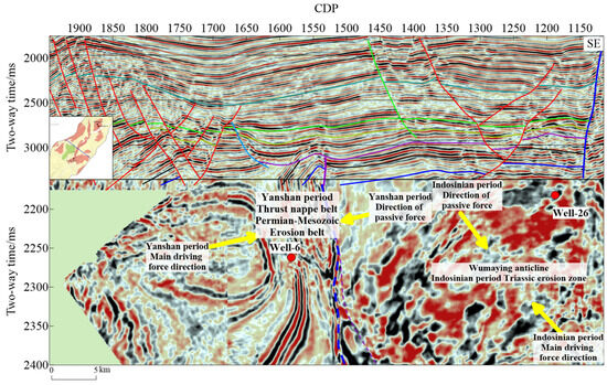 As shown in Figure 4, two sets of structurally distinct assemblages underwent compression during two different periods. During this process, in the near east–west trending anticlines and northeast trending thrust faults, the Permian to Middle Jurassic strata underwent varying degrees of erosion, leading to the formation of intricate anticlines, synclines, and thrust-fold structures. In the upper part of the Wumaying Anticline, erosion zones primarily occur in the Upper Triassic strata of the Indosinian Period. This anticline follows the near east–west trending structural axis of the Indosinian Period anticline, preserving thick Middle to Lower Triassic strata and relatively intact Paleozoic strata. In contrast to the northwest-southeast stress direction during the Yanshan period, this region exhibits typical structural features of thrust faulting and folding, characteristic of an oblique thrust-fold belt. Faults have dissected the large east–west trending anticlinal structures formed during the Indosinian period, and their interactions have resulted in the formation of a complex rhomboidal mesh structure. In the thrust fault zones, intense thrusting has occurred with significant displacement along the faults, resulting in severe erosion of the Middle Jurassic strata at the top of the hanging wall block. During the Late Yanshan Orogeny, distinct segments of the Permian strata demonstrate varying extents of erosion. In the extensional environment of the Cenozoic era, structural features underwent negative inversion, faults experienced backsliding, and the spatial overlap of these three factors intricately complicated the fault structure combination.